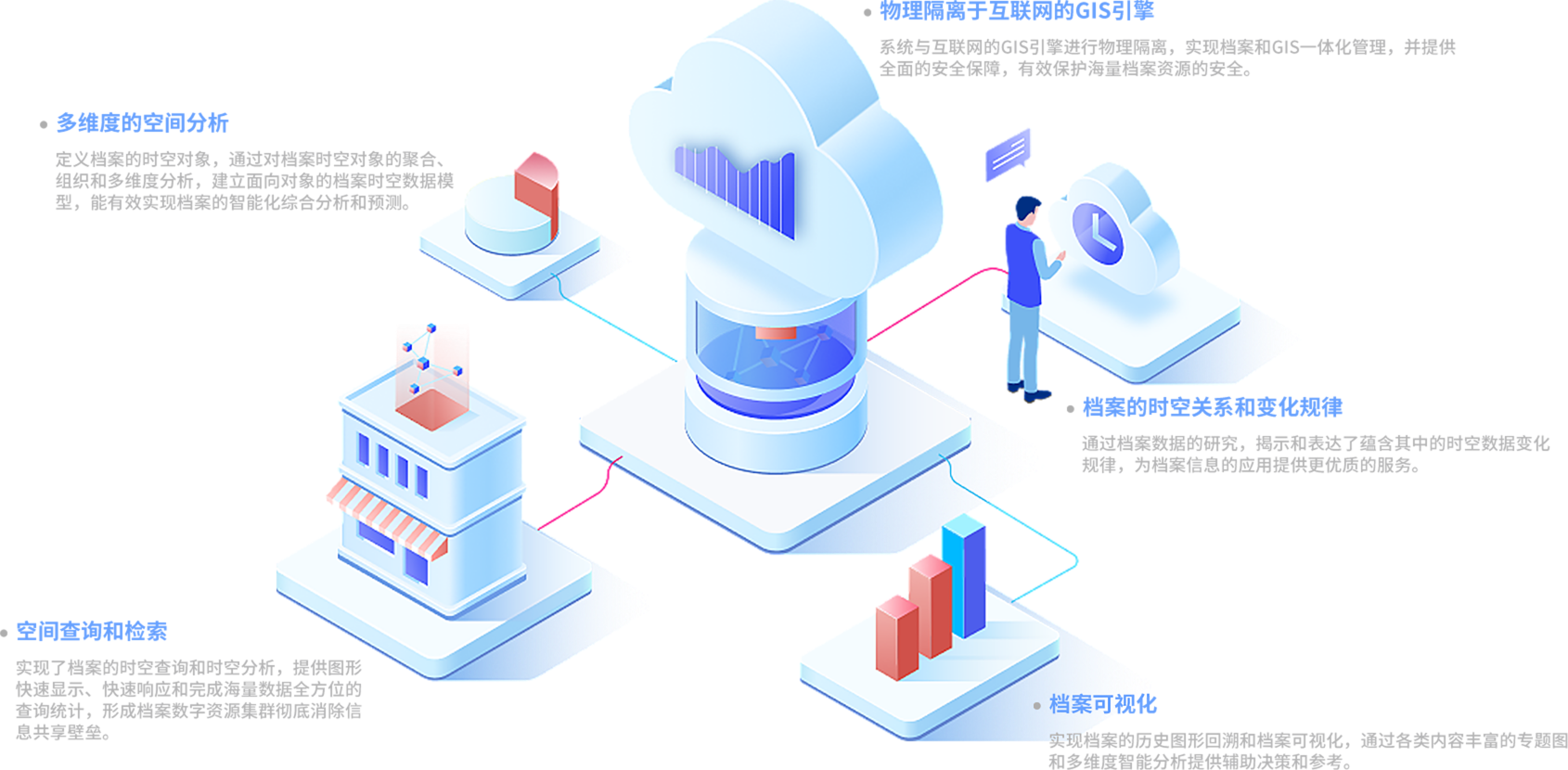 基于GIS的档案智能分析系统通过将档案资料与空间地理图形建立关联,真实、直观地反映档案所处地理位置,根据该位置可查看与档案相关的信息,并利用图形数据和属性数据与档案数据相结合进行分析,提供辅助决策功能,为相关单位和部门提供图形和档案服务。